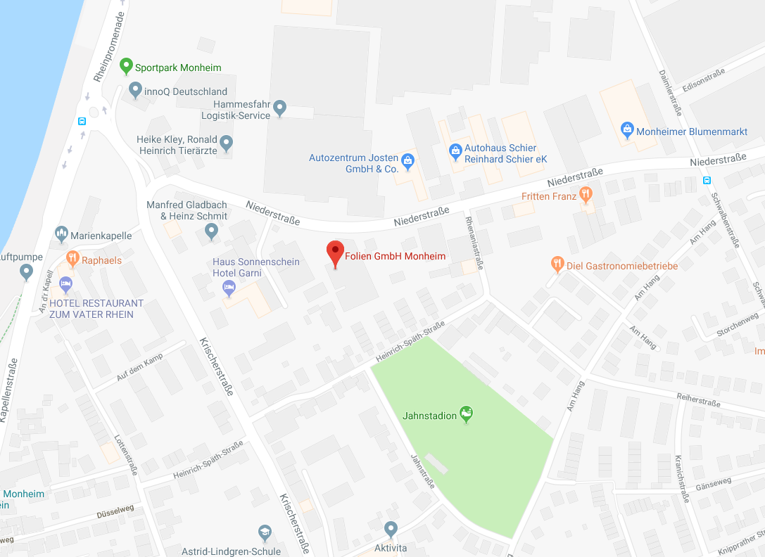 Die Folien GmbH Monheim liegt zentral zwischen Düsseldorf und Köln. Sie erreichen uns von der A 59, Ausfahrt 24 Richrath, indem Sie der Berghausener Straße in Richtung Baumberg (Monheim) folgen.